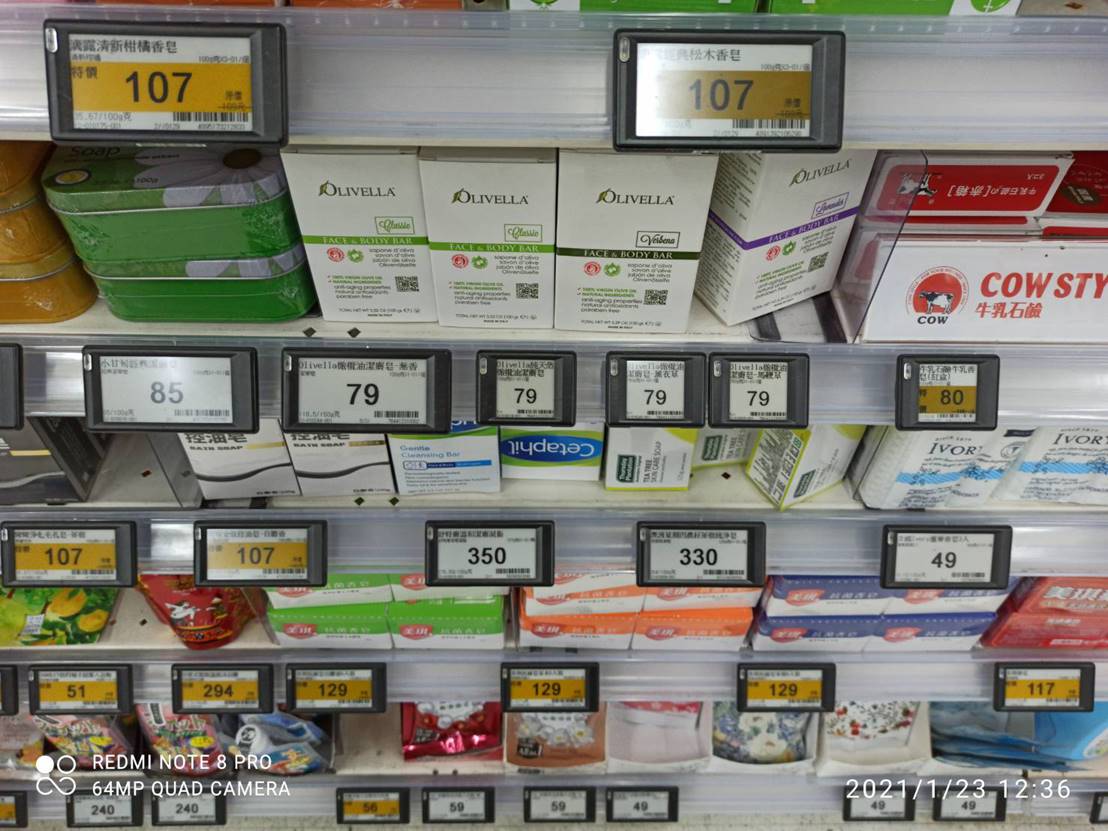 12:47 老郭 今天逛家樂福內壢店發現沐浴乳/洗髮乳/酒類等貨架上滿滿的電子紙標籤,電子紙的應用越來越深入,買元太跟著這會有關連嗎?